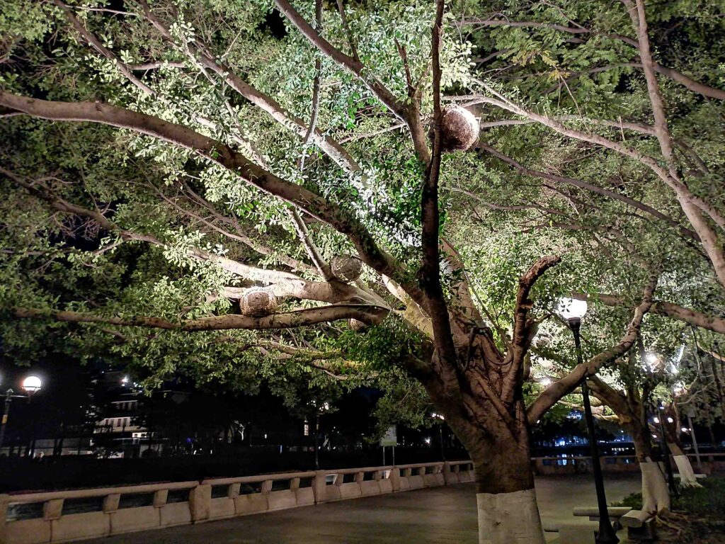 枝の上にたくさんのライトが取り付いています。夜はとても綺麗です。20241221